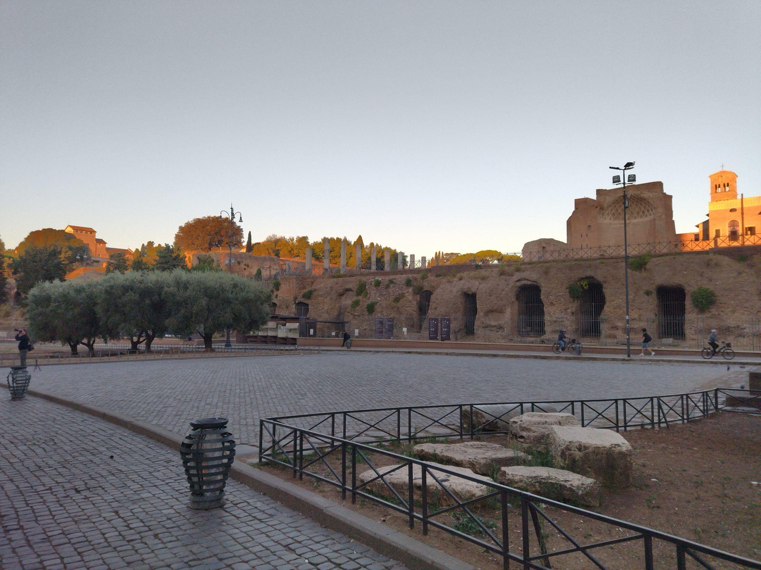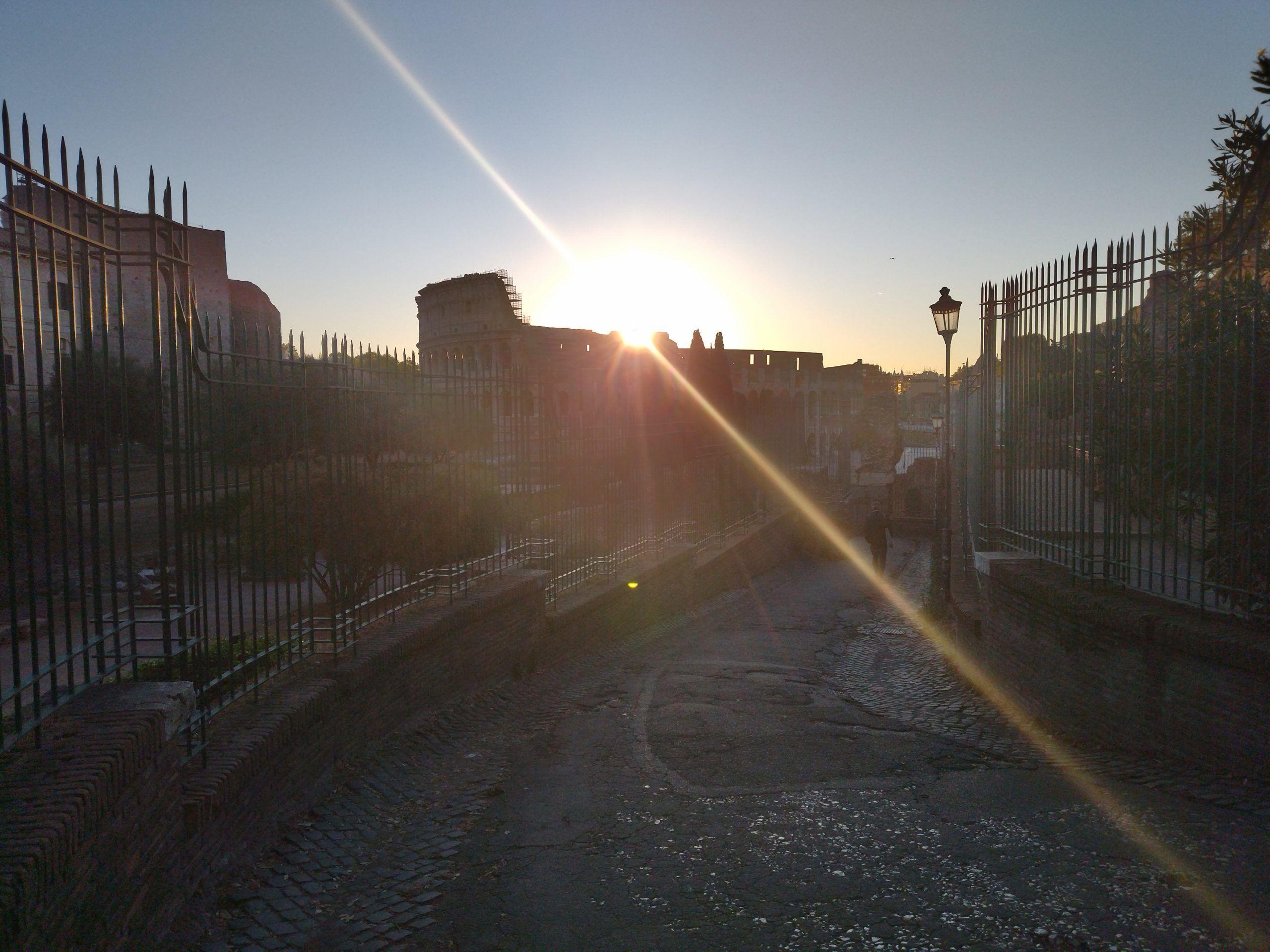 I directly take the metro to the Colosseum. Not even out of the station, and you can only see it. A massive ring of classical architecture, in the middle of a vast paved place, surrounded by its fellow roman ruins. What a feeling, to stroll around such an iconic piece of History, which saw the height and fall of the most powerful empire of its time, now one of the most visited attraction on Earth. And yet at this early hour, nobody is around to spoil the moment. I feel privileged to be here, watching the sun slowly rising over the Colosseum. I climbed a path exactly opposed to where the sun wasa emerging, and got to witness some awe-inspiring moment, when the astral light crowned the jewel of Roma.