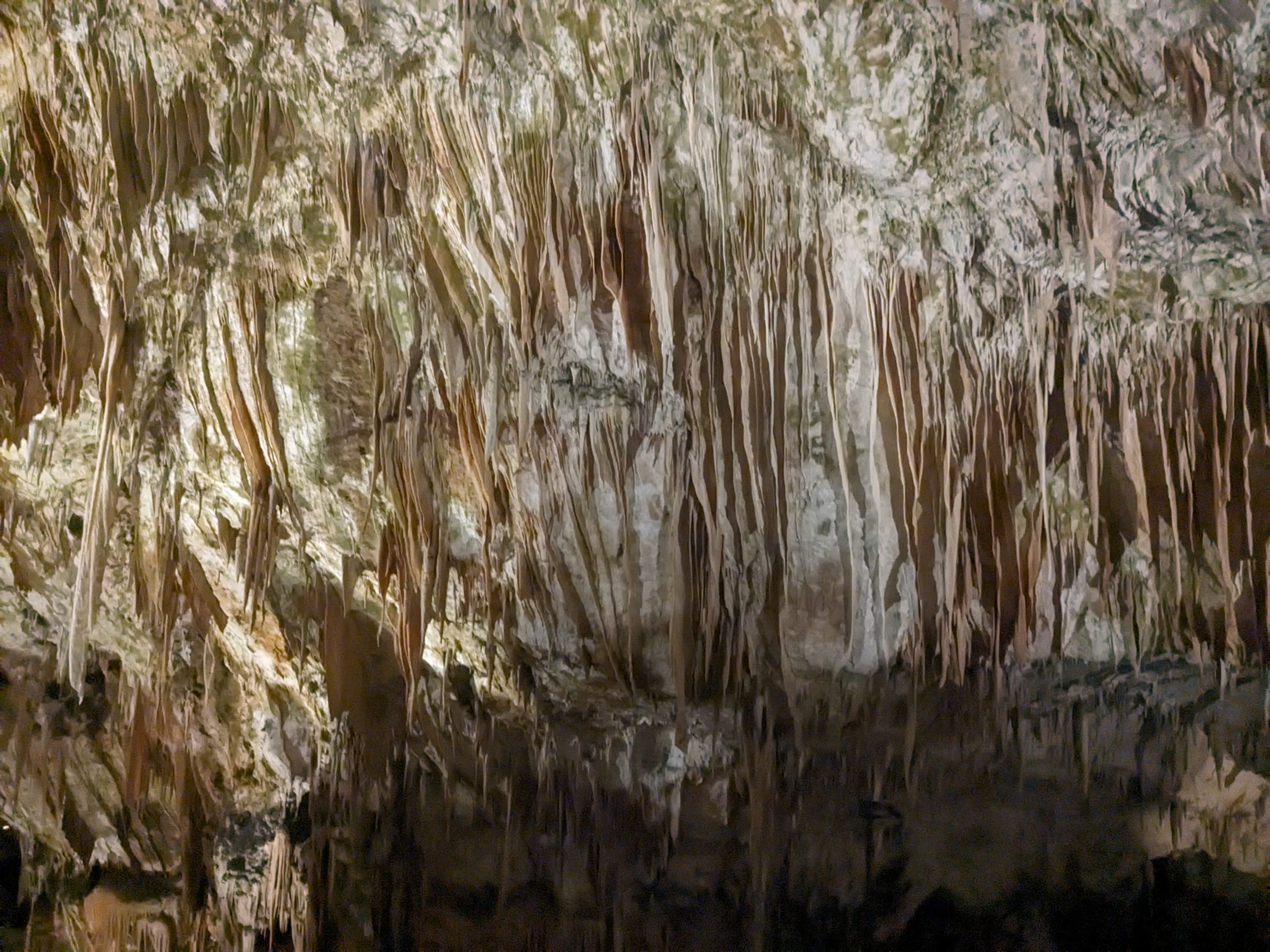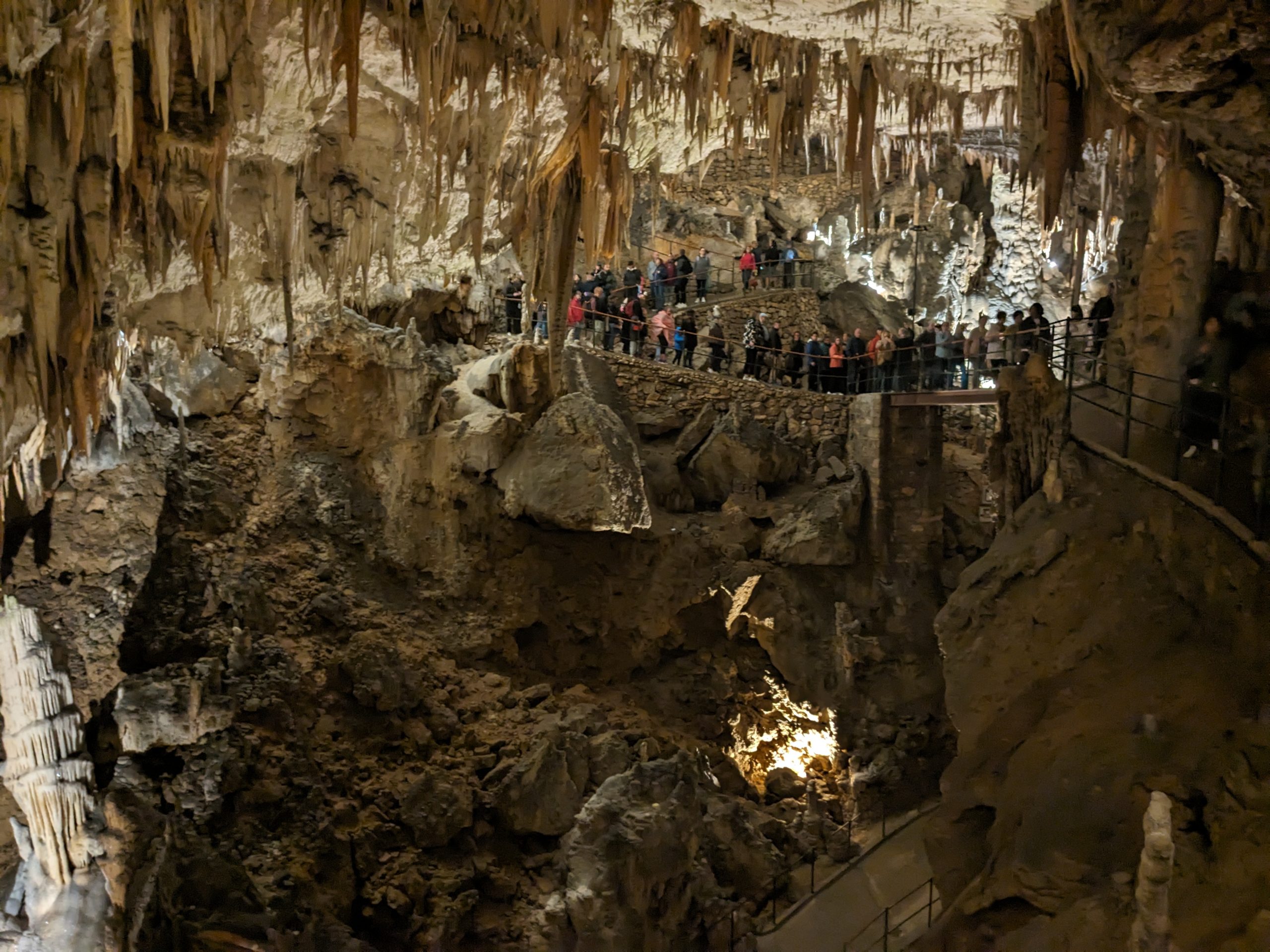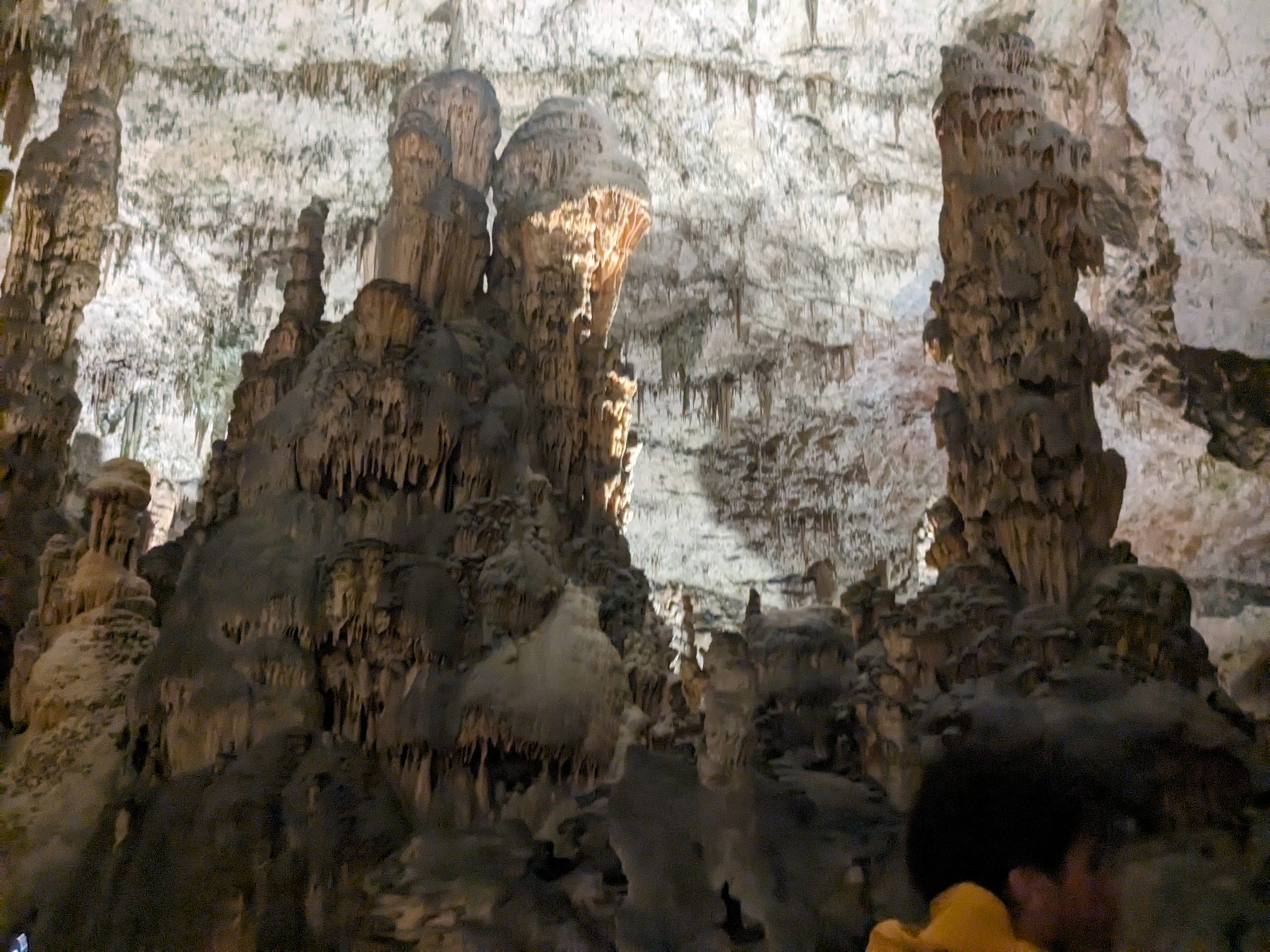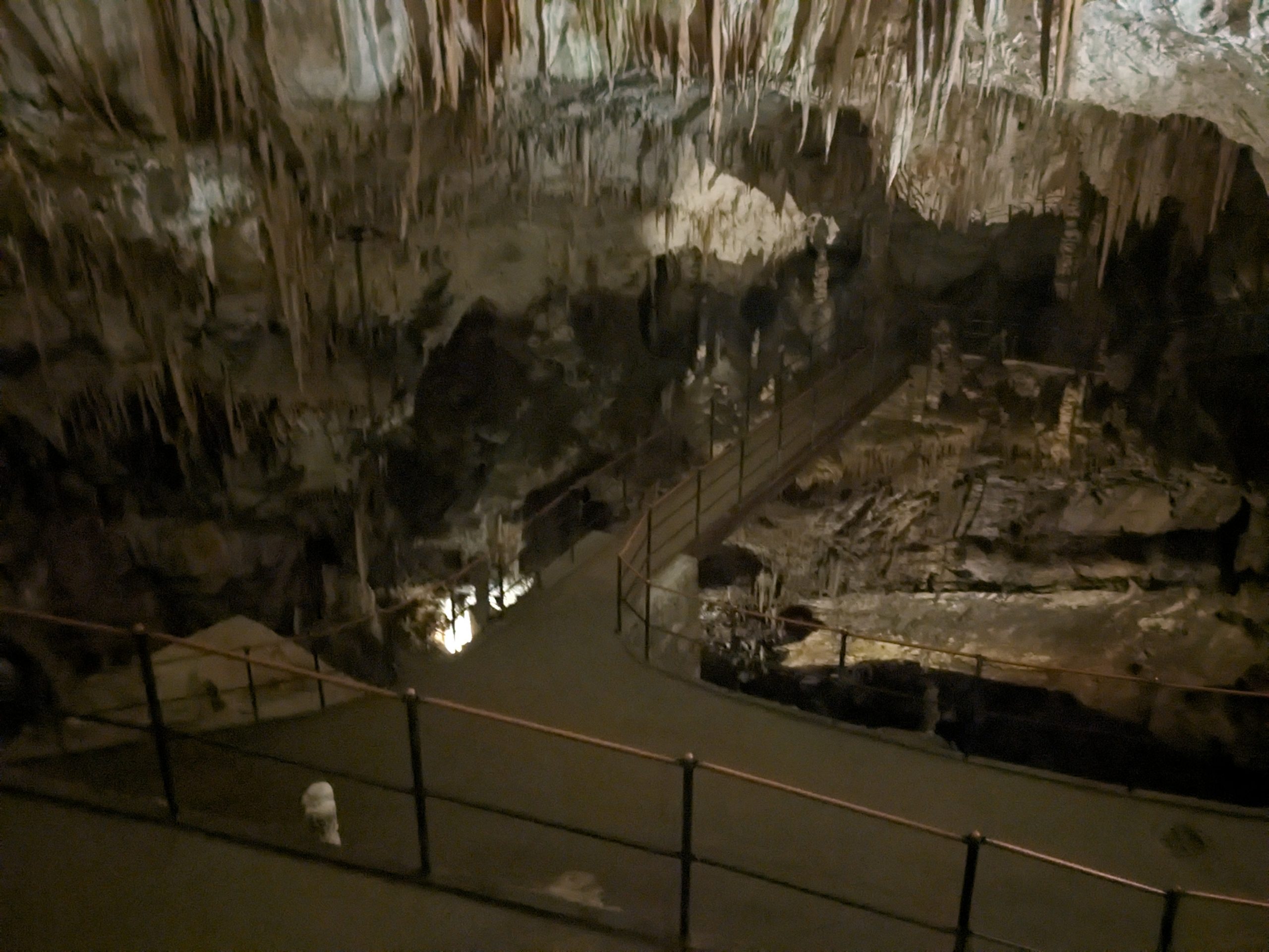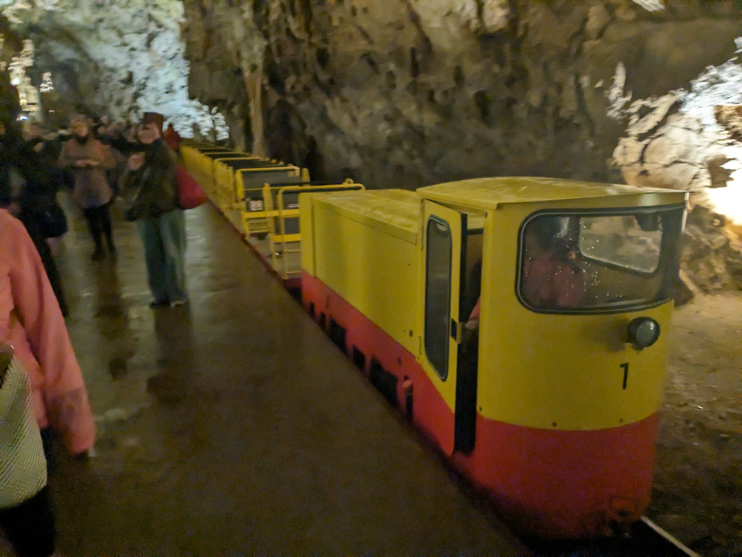 At least I managed to forget my worries for the 10 min of the fully underground train ride! A small, but very long, tourist narrow gauge railway going a few kilometers underground to the main caves. It’s only two-person seats on a metal planck, there are no walls or roff. The rock is cut as less ass possible: even seated, I opted to retract my head many times as the cave roof drew very close.