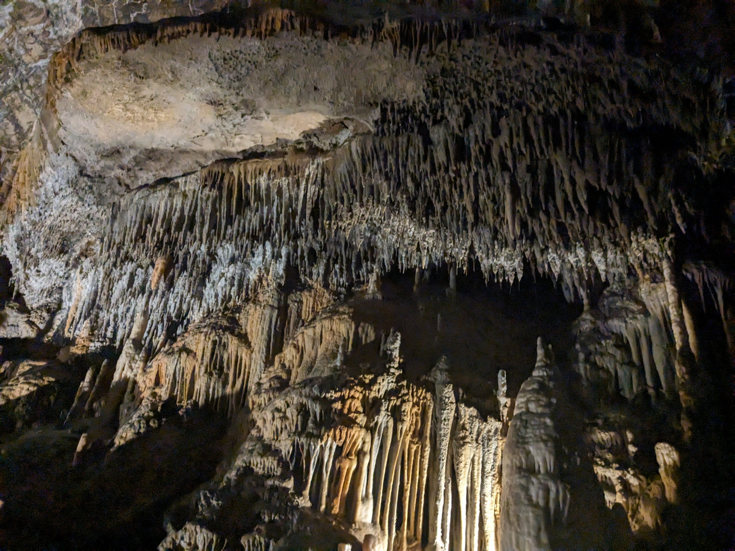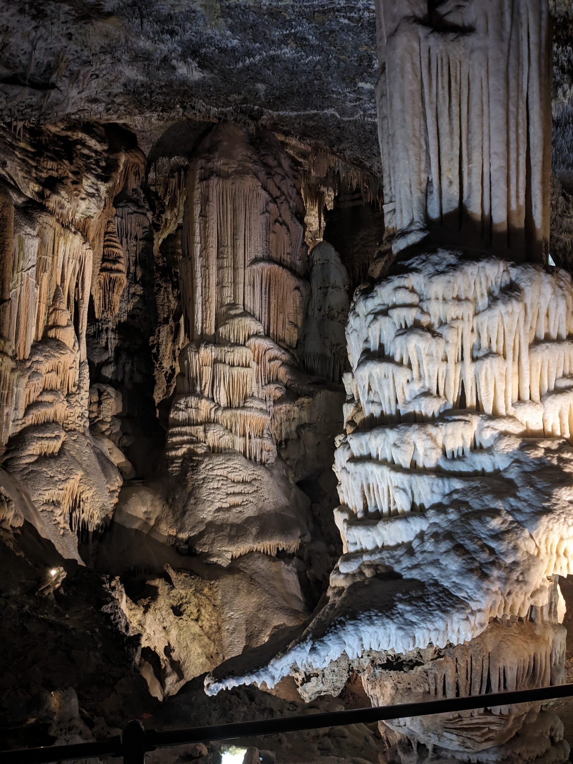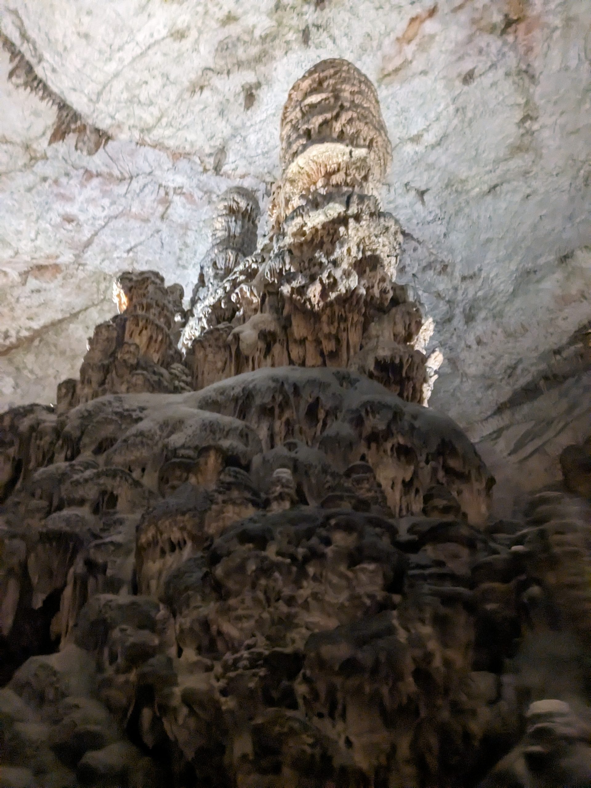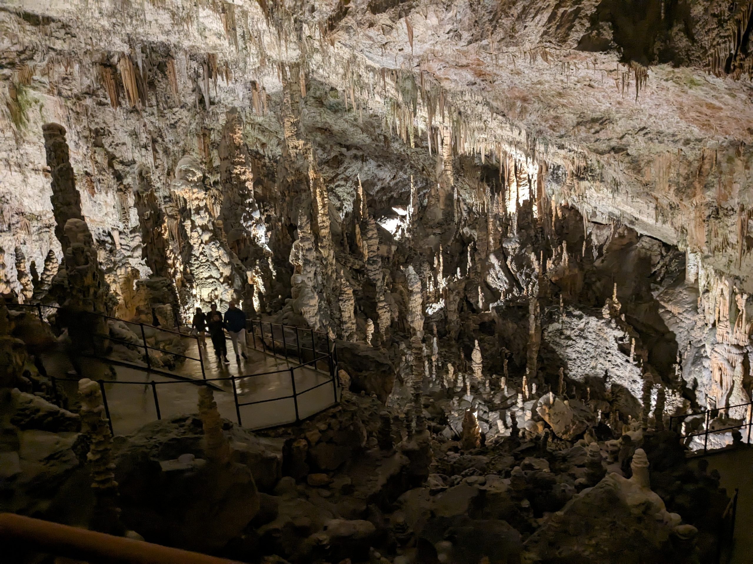 At least I managed to forget my worries for the 10 min of the fully underground train ride! A small, but very long, tourist narrow gauge railway going a few kilometers underground to the main caves. It’s only two-person seats on a metal planck, there are no walls or roff. The rock is cut as less ass possible: even seated, I opted to retract my head many times as the cave roof drew very close.