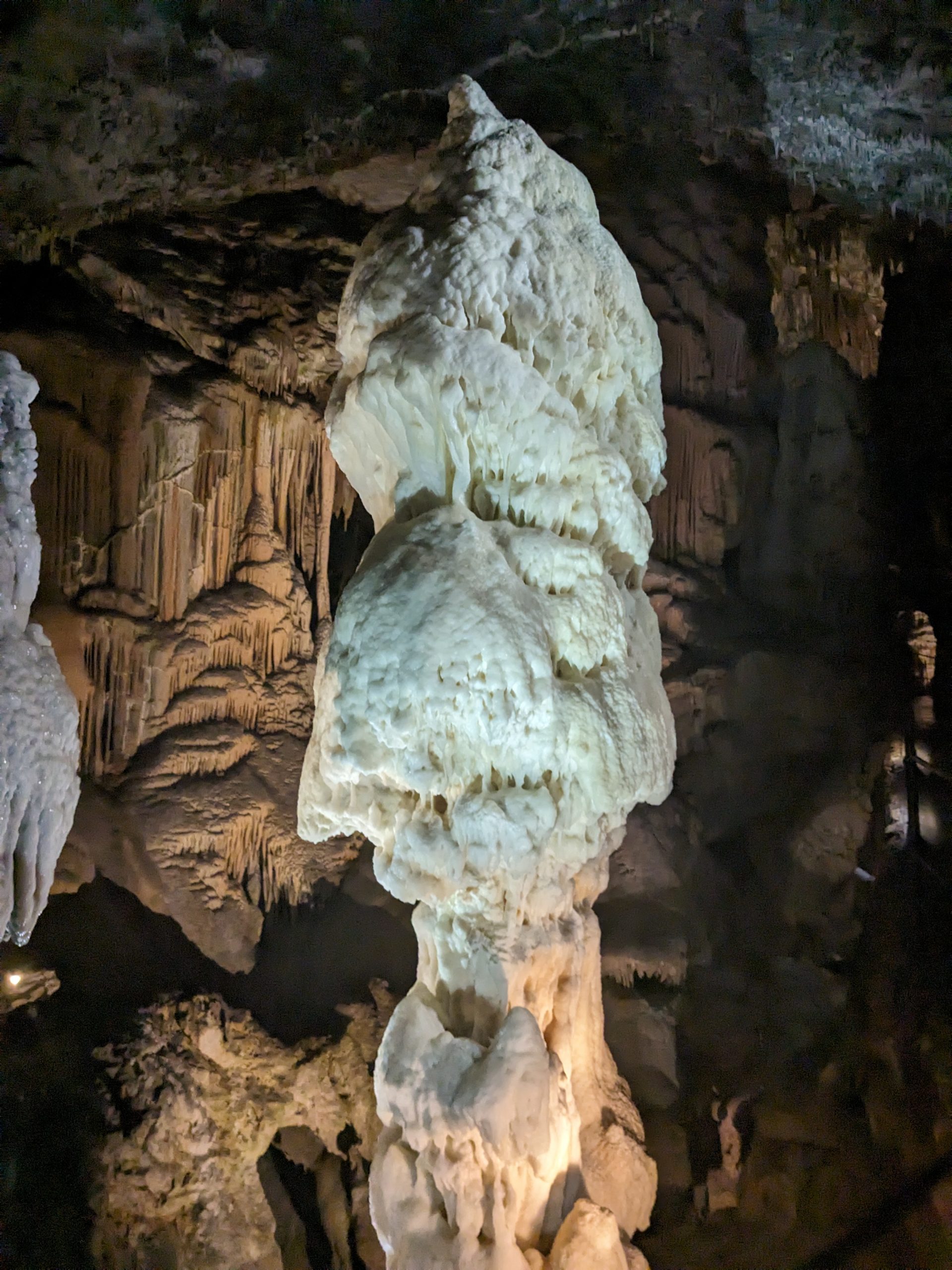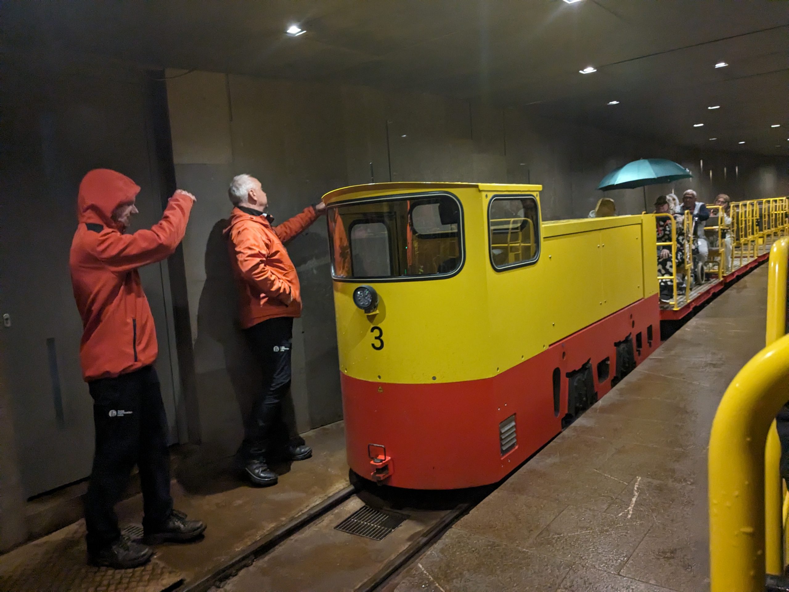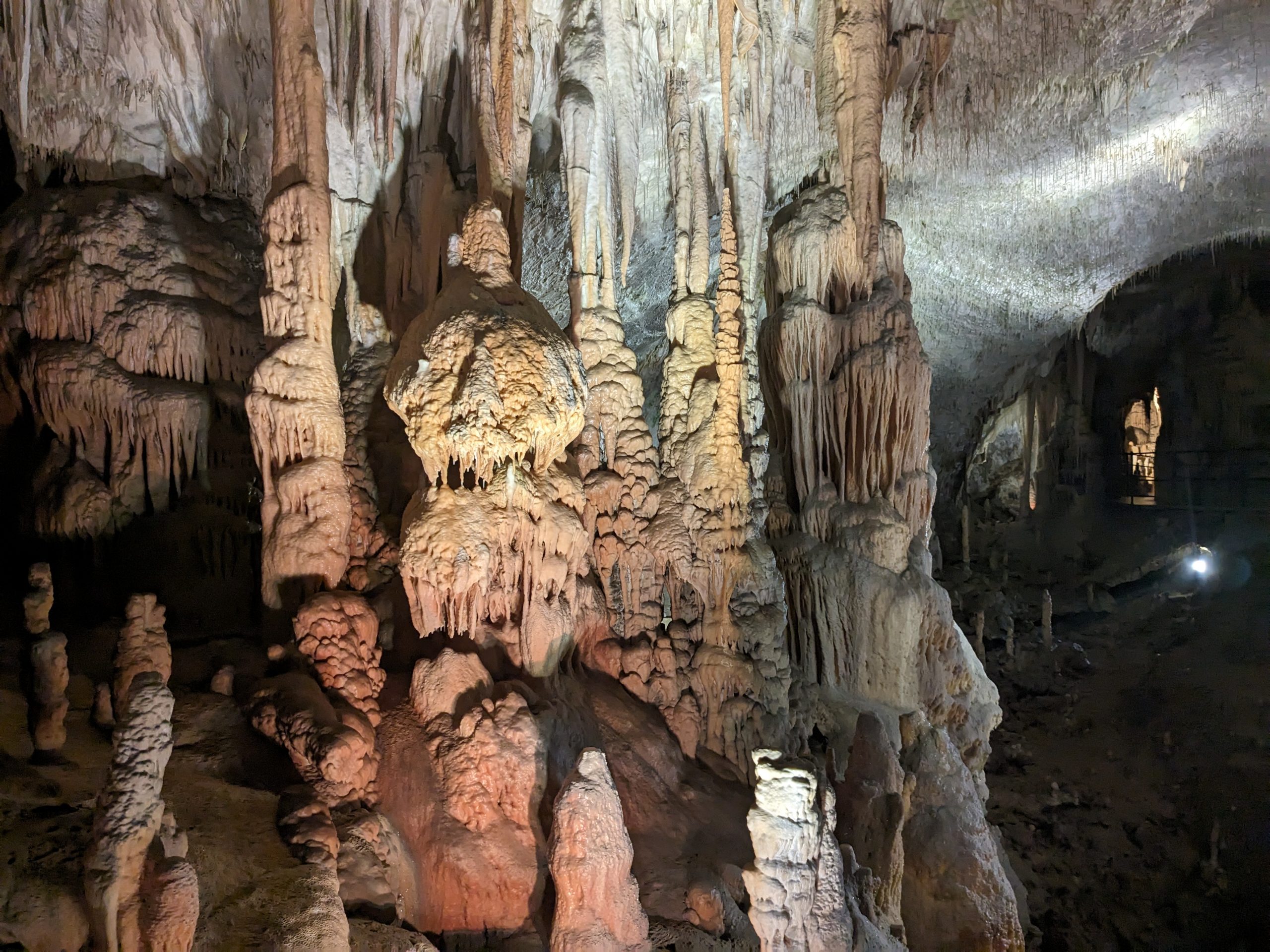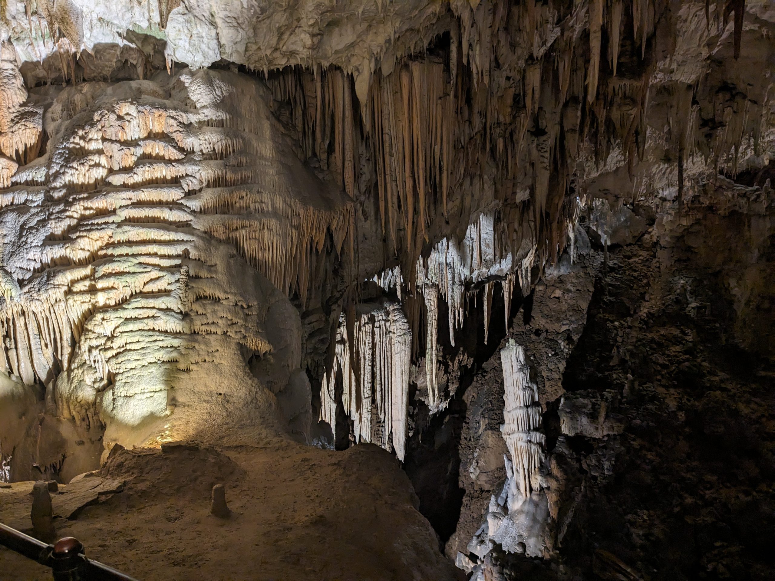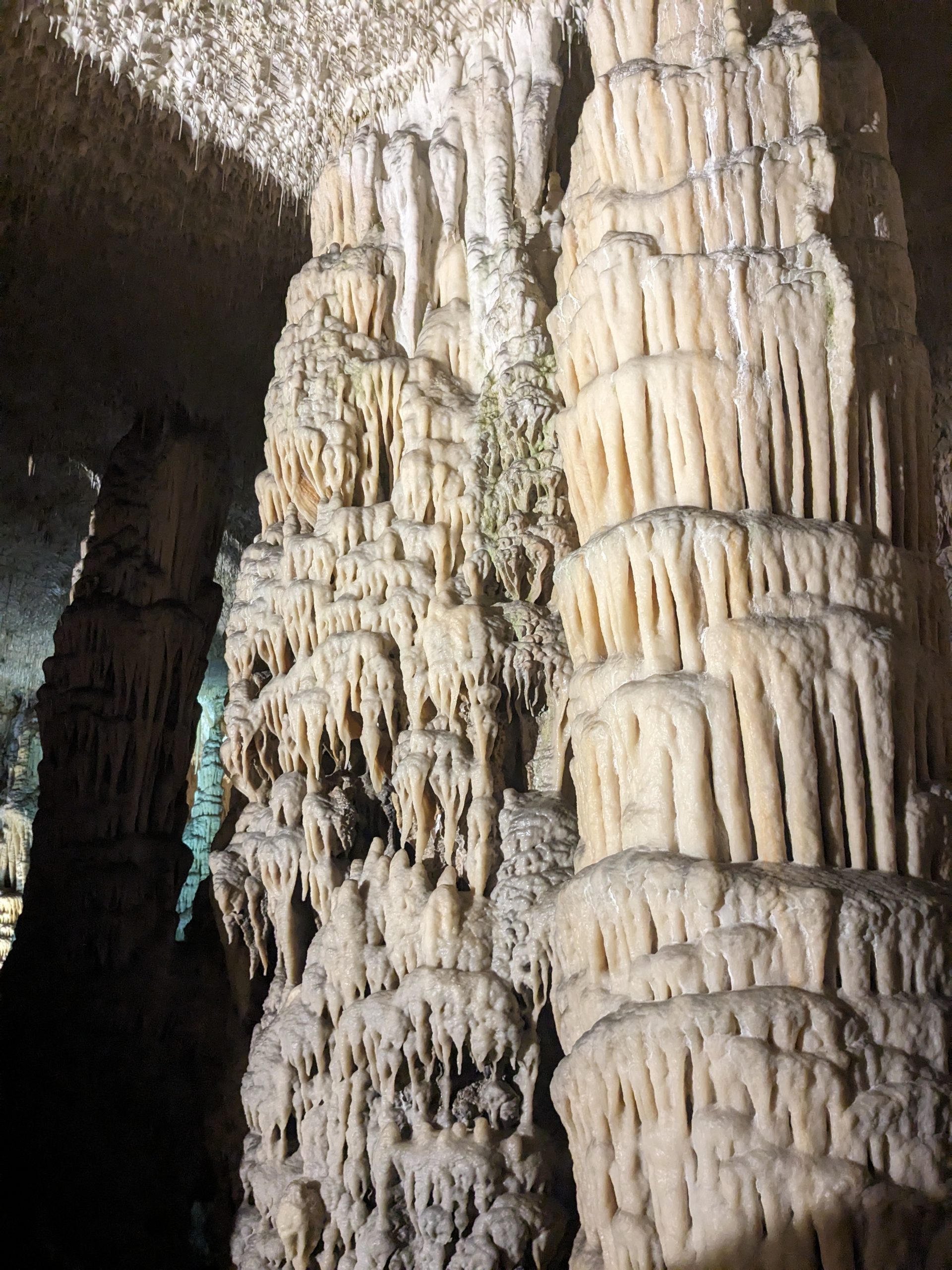 At least I managed to forget my worries for the 10 min of the fully underground train ride! A small, but very long, tourist narrow gauge railway going a few kilometers underground to the main caves. It’s only two-person seats on a metal planck, there are no walls or roff. The rock is cut as less ass possible: even seated, I opted to retract my head many times as the cave roof drew very close.