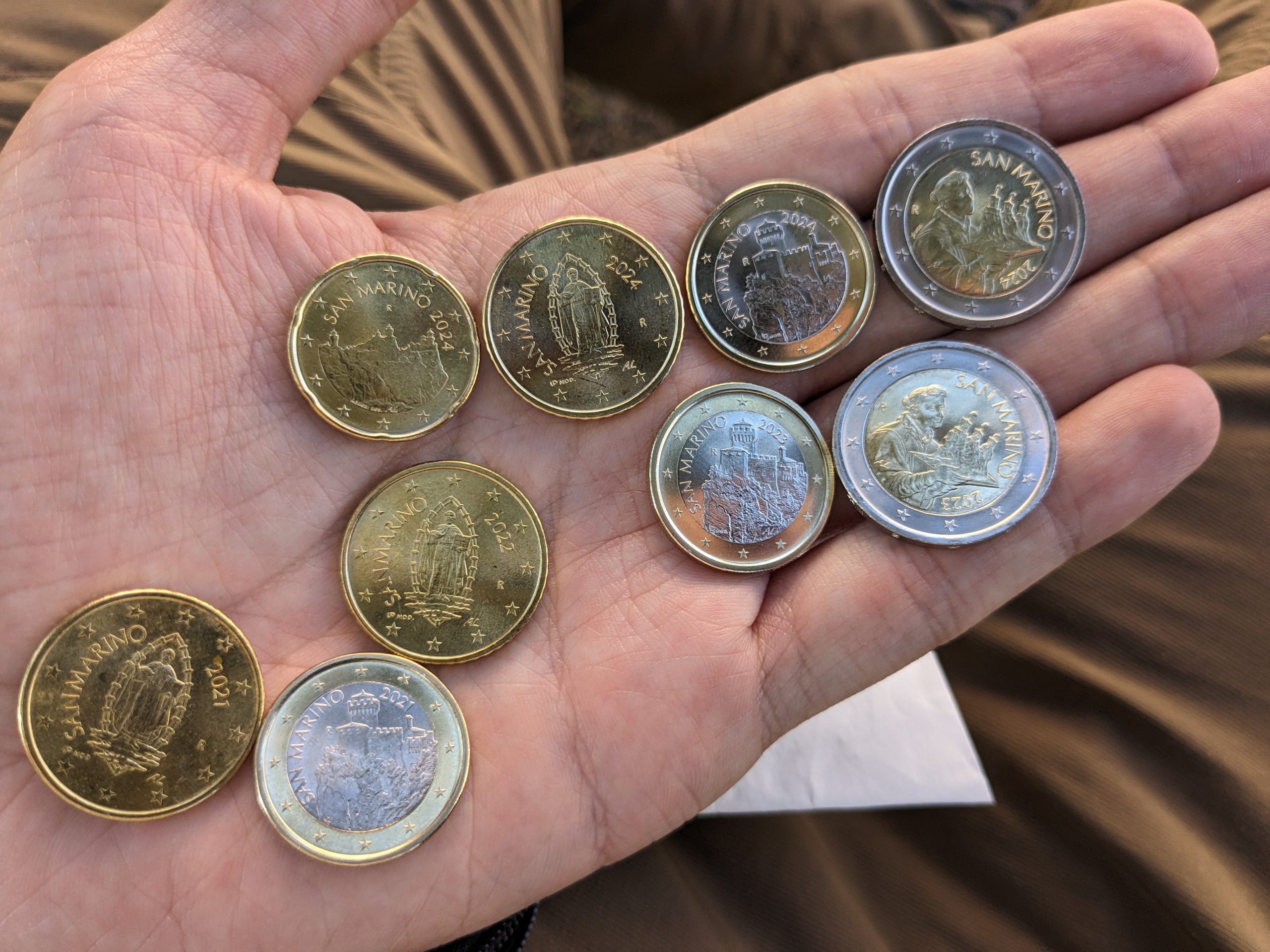I went to a shop to get my San Marino keychain, and after getting my change back, I asked if she had some San Marinese coins. Yes! I know it’s borderline cheating, but still, I didn’t buy them. That’s fairplay in my book.