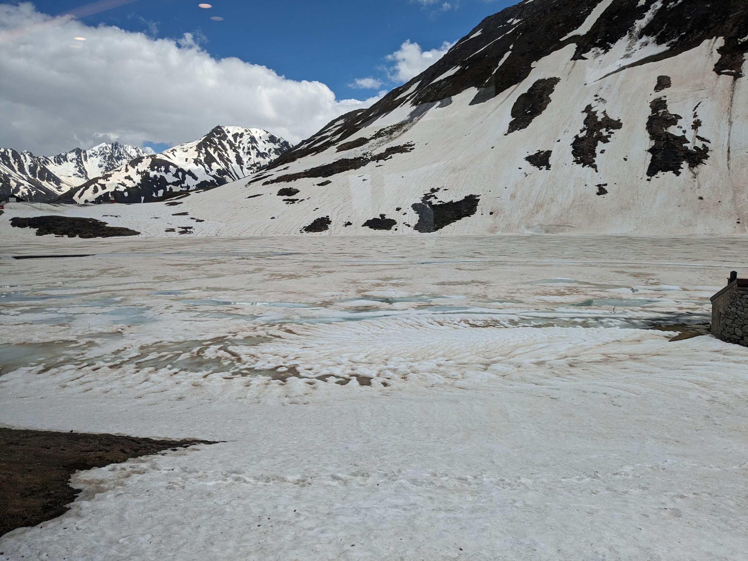In Andermatt, we changed for what was possibly the best part of the trip: climbing to the highest point of the line, at over 2,000 m! The ascension was fast, zigzaging along the mountainside, with a jaw-dropping view over the valley. Up there, we followed an half-frozen lake, full of blocks of ice like small icebergs. I haven’t seen that since Norway, three months ago.