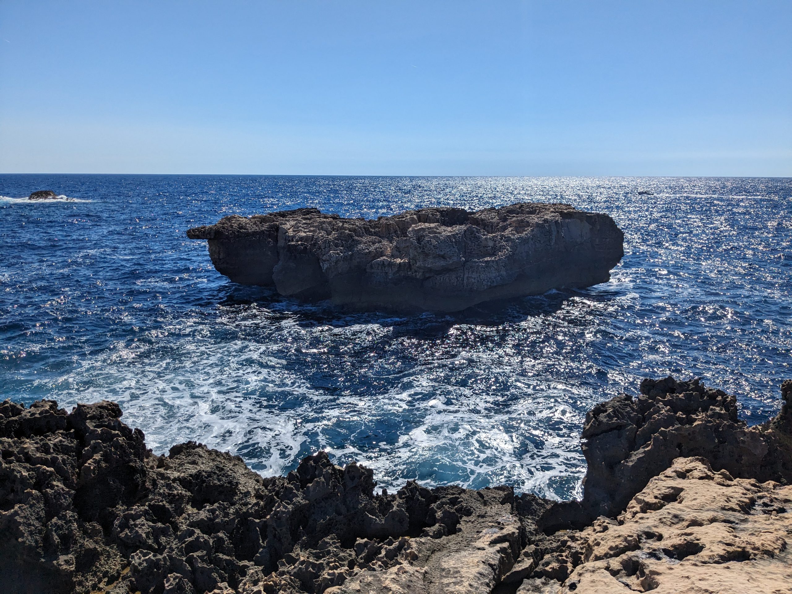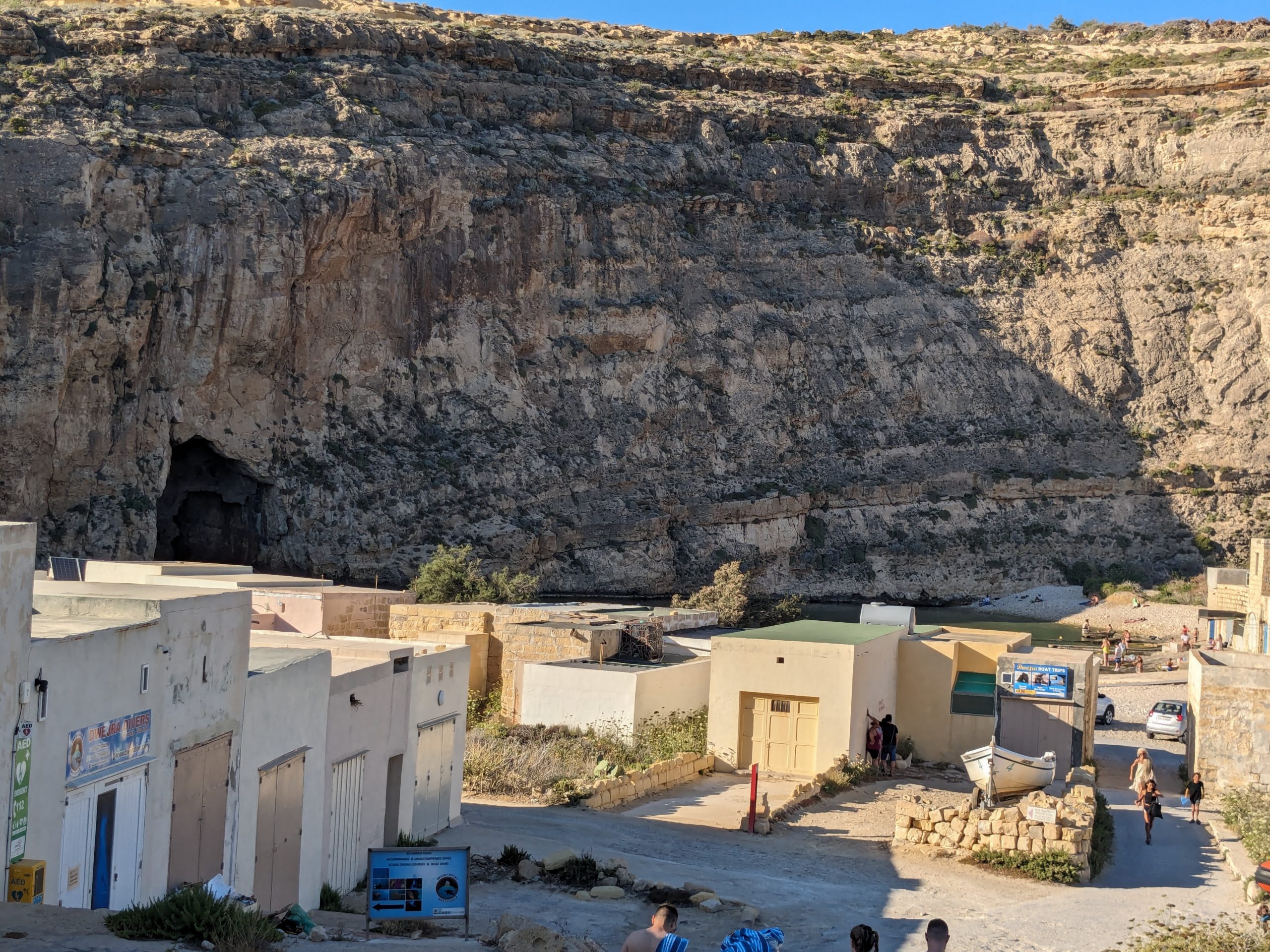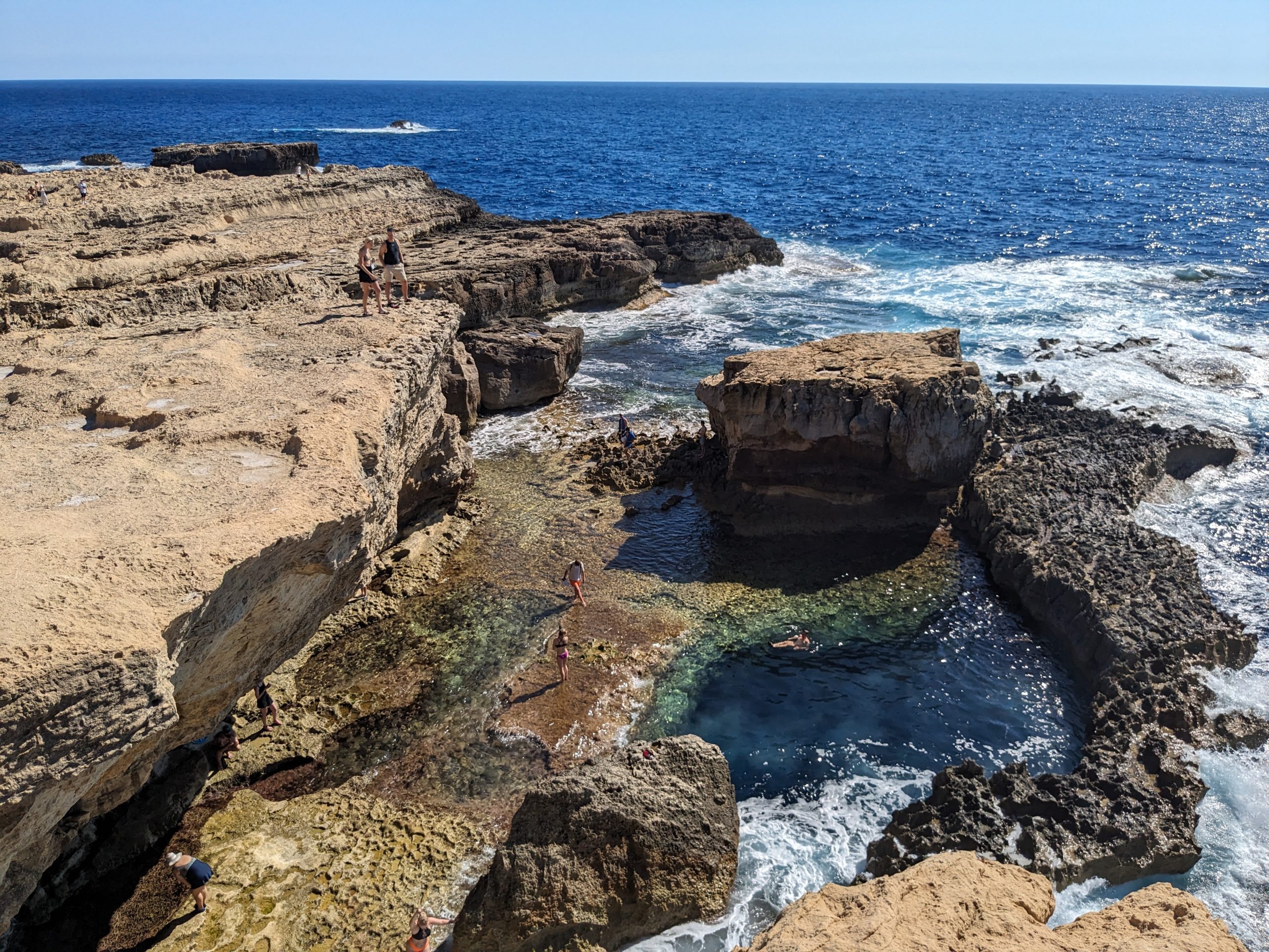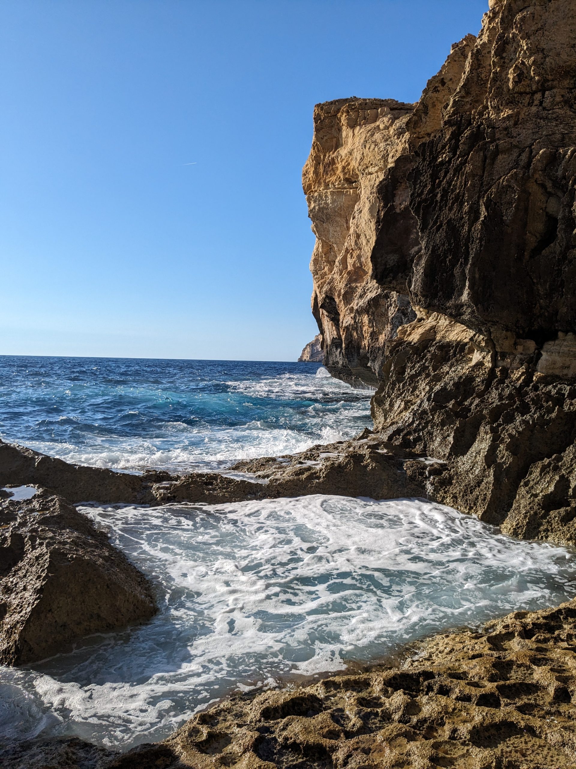 I stayed there for a while, until it was time for my next destination: the Dwejra nature reserve. This large area of flat rock, dotted with natural holes with salt deposits was the site of the famous Azure Window, a natural stone arch, which sadly collapsed (naturally!) in 2017. It is still a fantastic place to visit, with enormous cliffs dominating the sea, and the Blue Hole, a small pool separated from the sea by a small barrier of rock. It still comunicates with it though. There were plenty of people swimming in there. I wanted to join them, but first, it was tricky to find a path that was seas urchin-free (there were in every holes!). Then, suddenly, the rock gorund dropped dramatically, basically as an underwater cliff. Part of me wanted to jumped in there and enjoy the water, but mostly I was way too scared. I’m really not good with water, quite phobic honestly. So I just sat on the ridge, water up to the hip, enjoying the waves.