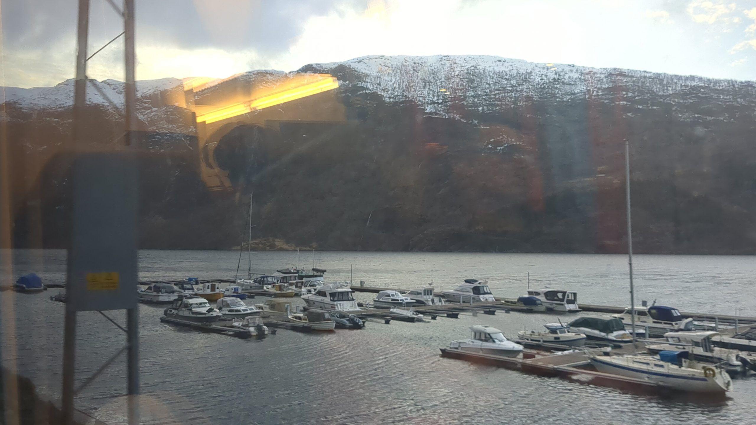 Luckily, the train waited for us, so we could immediately enjoy the ride. I picked up the wrong side of the train, but still got some jaw-dropping sights. After half an hour, we reach the shore of the fjord in Flåm. I barely went on the platform to snatch a few pictures, but we had to get back up already. Flåm is the Northermost point of today’s trip, and thus the northernmost of the Tour, but also in my entire life so far. But it’ll be ridiculously South soon.