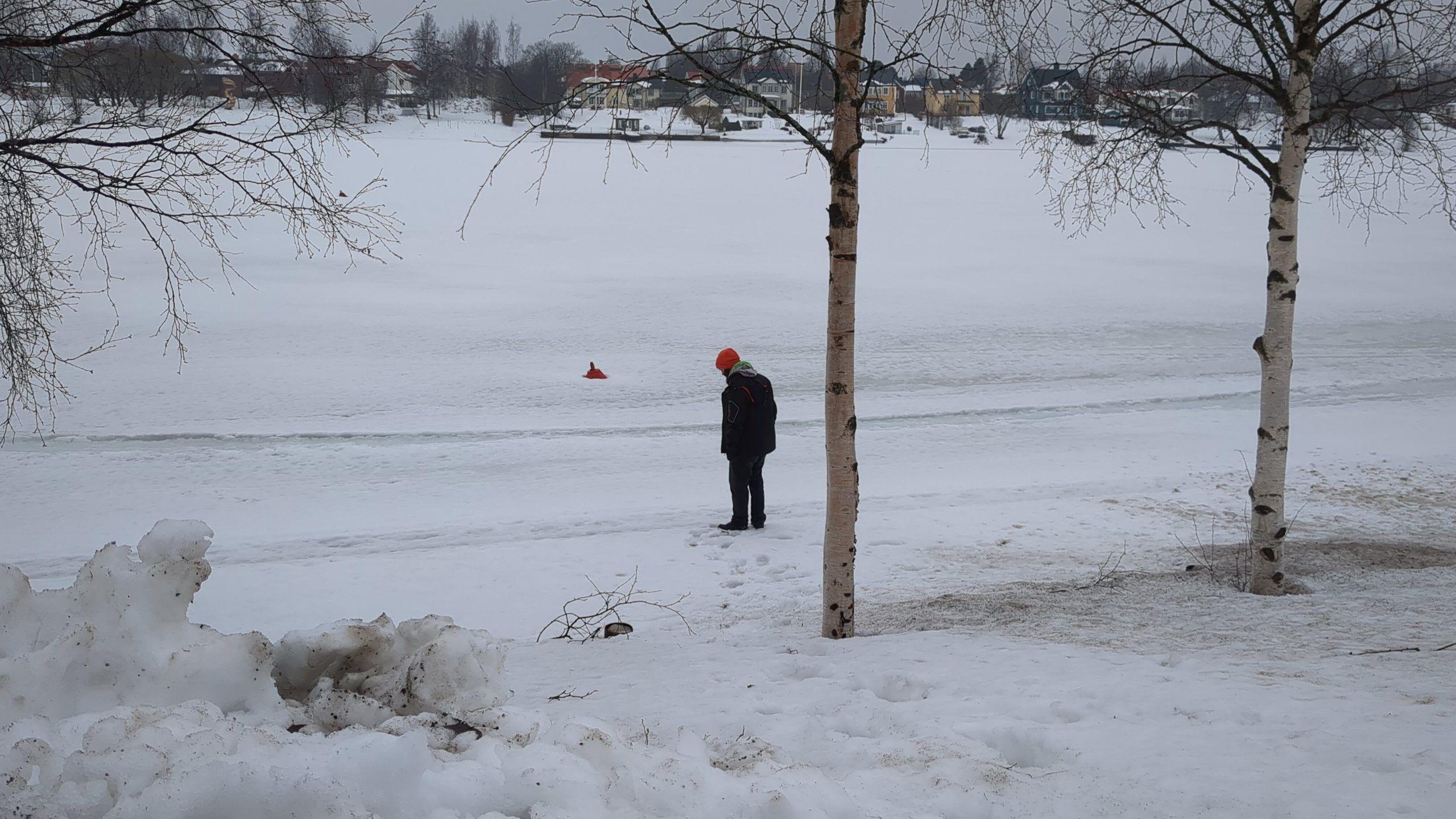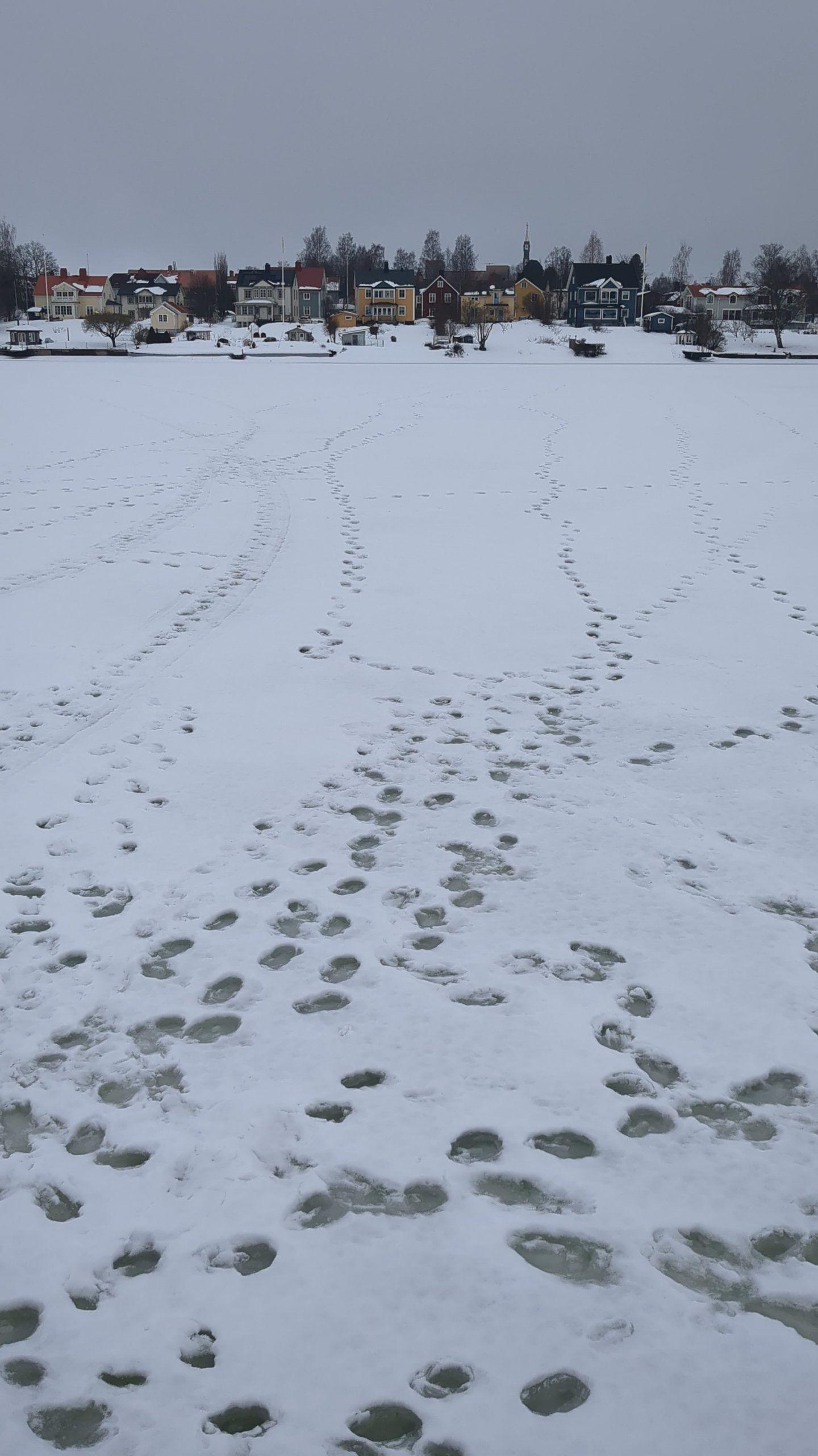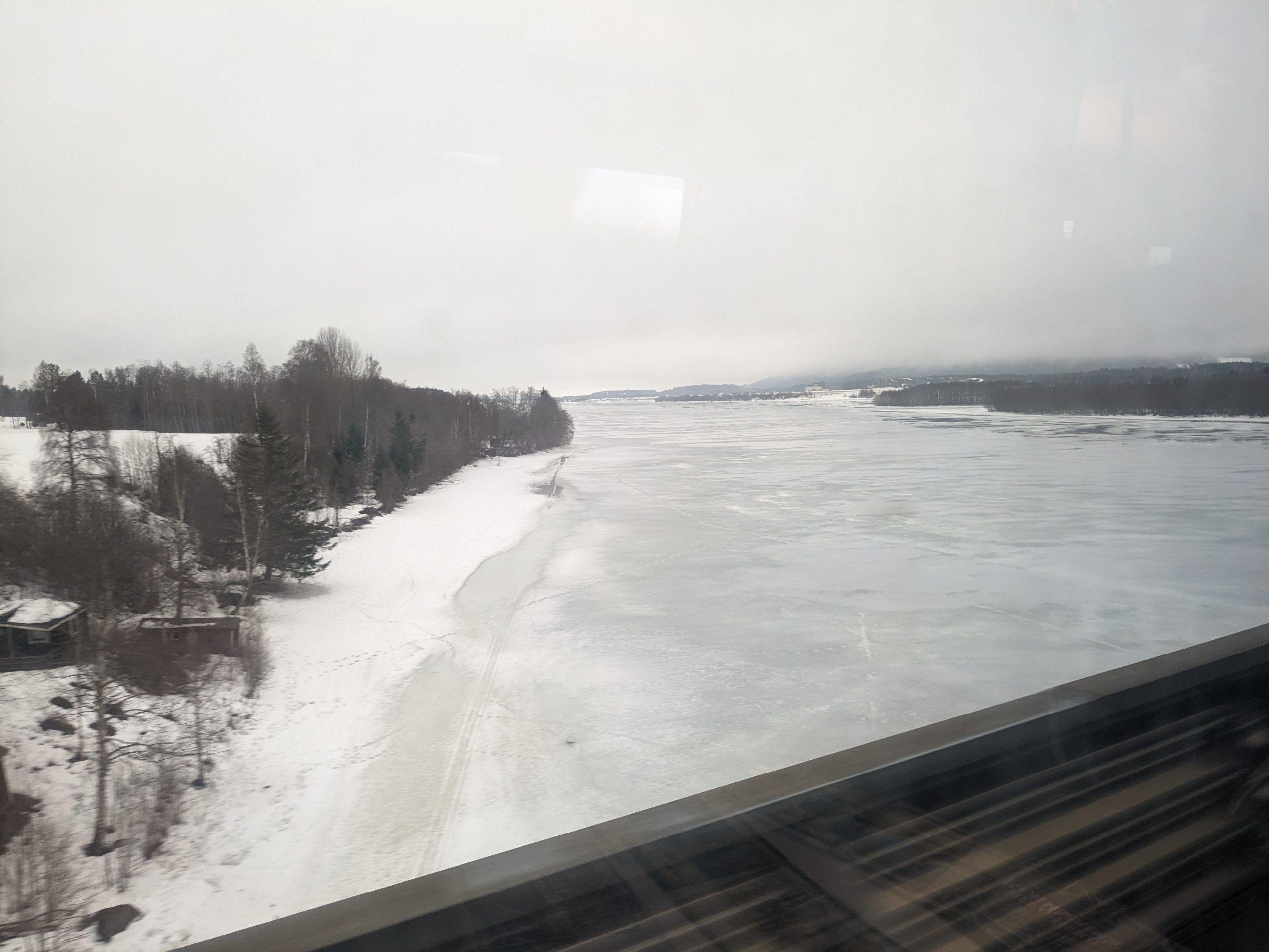 The first leg of our long journey today is three-hour long up to the charming town of Umeå. We took a bit of time to go to the main place, reach the river Umeälven. It was completely frozen, with numerous footsteps across it.