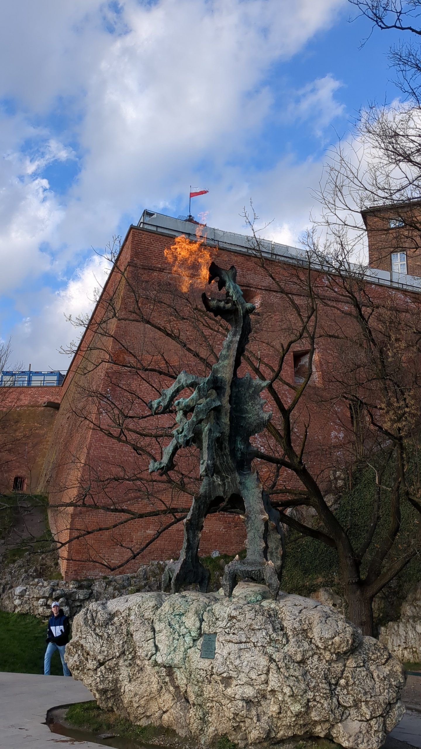 We came back to the old town, wandering randomly through its great cobblestoned streets. After a deserved break and a delicious hot chocolate (which was actual melted chocolate, yummm), we headed back to the castle, as we missed the Kraków dragon statue earlier. To be frank, it does look like it was made by a kid, but what makes it pretty cool is the flame coming out of its mouth every five minutes.