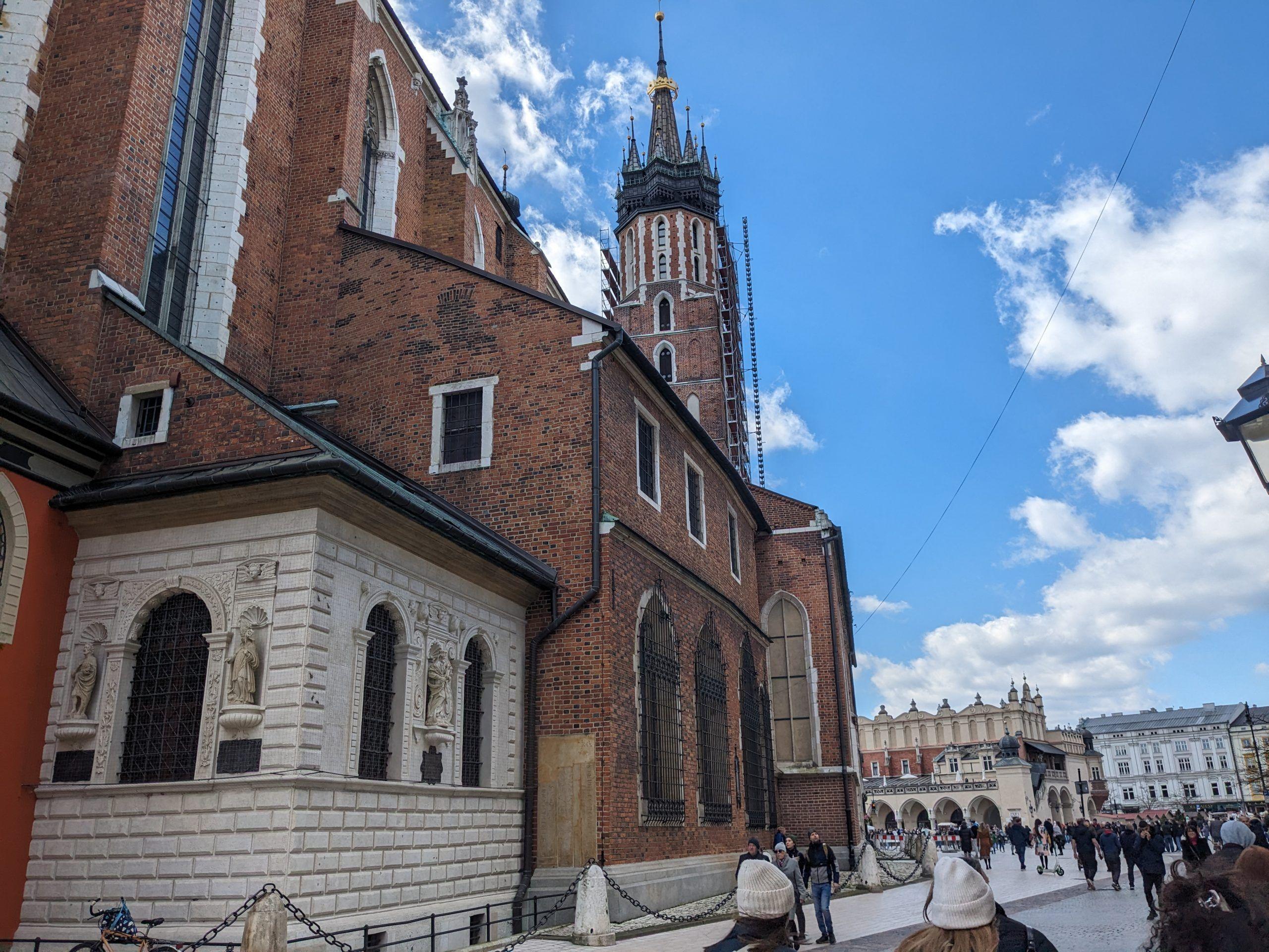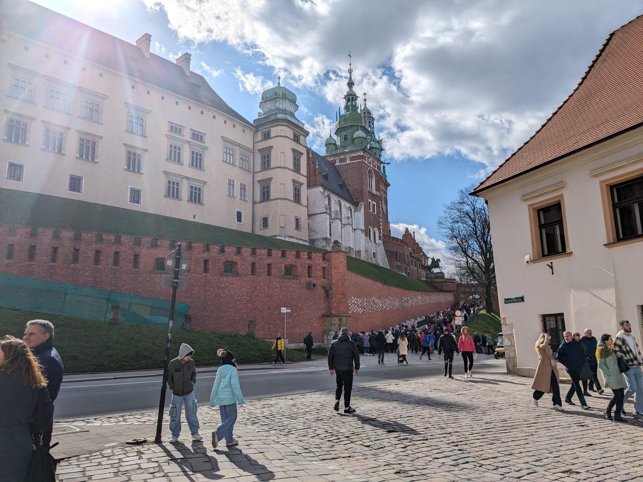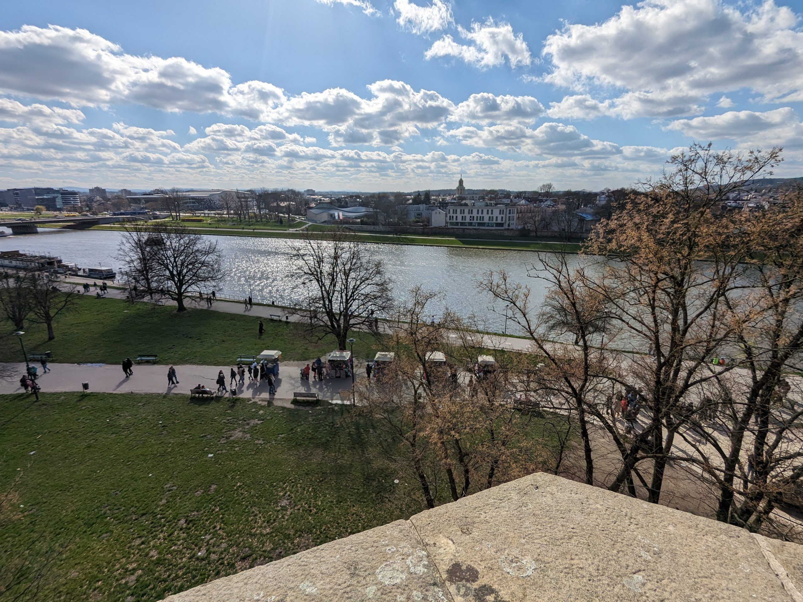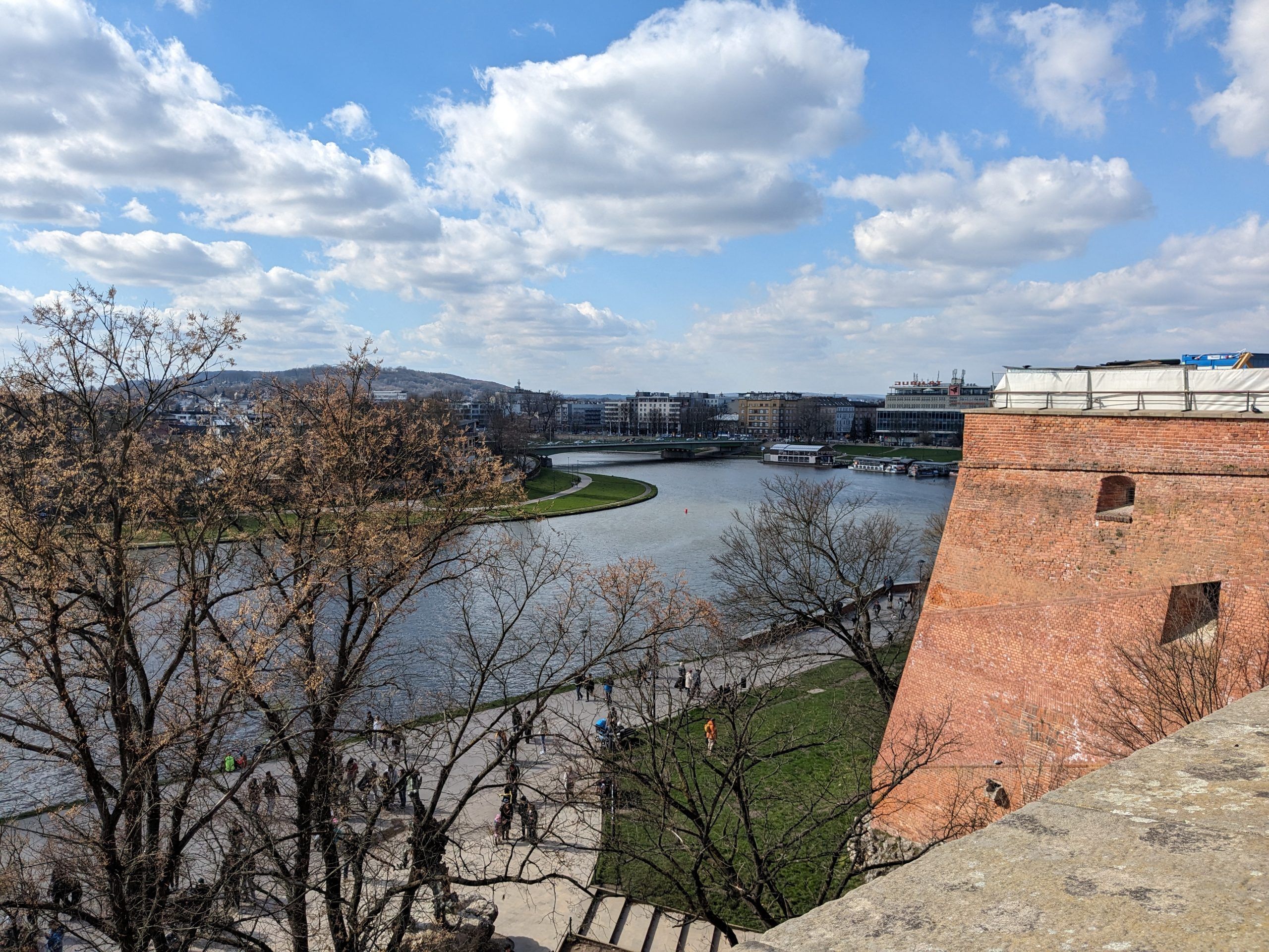 After that, he led us to the center of the old town. In the middle of the vast main square lies a beautiful market building. We kept strolling through the center until we reached the foot of Wawel Castle, perched on its promontory. Tomász went on his way, and we went for a visit of the castle’s court. It’s a magnificent complex of walls, towers, church and living quarters, all of red bricks, constructed high above the river Vistule. The remparts are now a balcony over te river and parks.