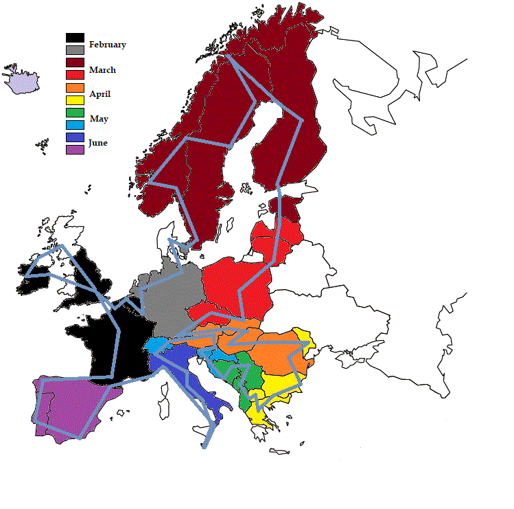 After that we can slow down a bit, going South through Finland, the Baltic countries, Poland, part of Central Europe, then heading East to Moldova, and the rest of Eastern Europe up to Greece, back North through the Balkans, finishing Central Europe East to West, until crossing Italy in its entirety to reach Malta, then back through Southern France and finally closing it all in the Iberic peninsula.