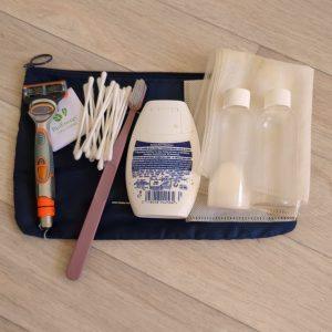 In its own small packing cube, with the essential: toothbrush and toothpaste, razor, q-tips, bottles of shampoo and soap, in a small plastic bag to avoid accidents.