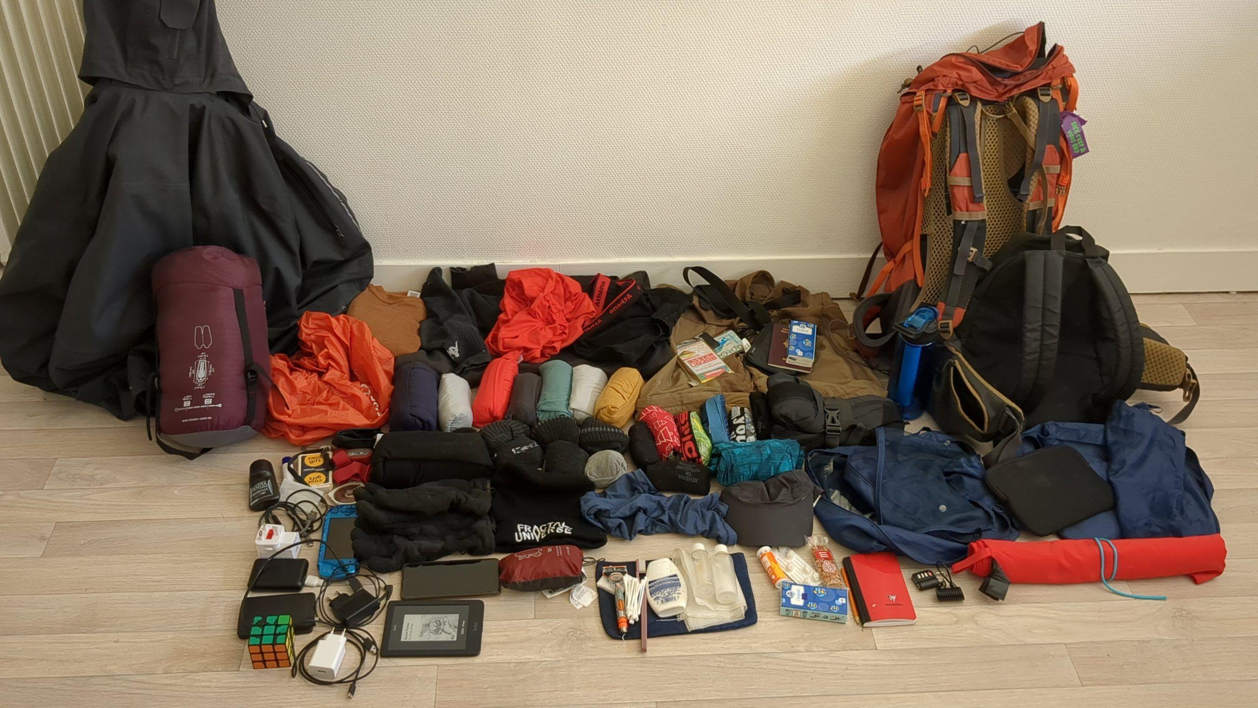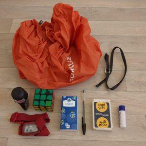 Backpack water protection, deodorant, Rubik’s Cube, headlamp, tissues, pen, playing cards…